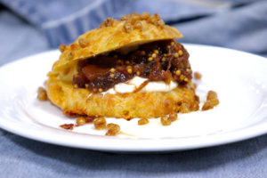 Aged Cheddar Gougères stuffed with Braeburn Apple Mostarda from their Naramata Orchards, Crème Fraîche, Crispy Wheat paired with Liquidity Wines 2015 Viognier.
