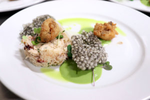 Fisherman’s Market Crab, Fried Codfather’s Mussel, Buttermilk Herb Emulsion, Green Apple, Kohlrabi, Squid Ink Cracker paired with Little Engine Wines 2017 Silver Chardonnay.