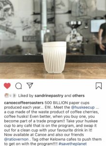 Canoe Coffee has been instrumental in bringing the HuskeeCup swap movement to Kelowna – buy a cup repurposed from coffee husks, re-use the cup at a participating coffee shop, get your coffee in another HuskeeCup, then keep on doing what you’re doing for a caffeinated experience without the unnecessary waste.