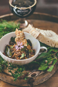 This dish had a lot going on and was a play on one of my first From The Wild bush camp dishes when I shot season 4, episode 9. It was that adventure that made all this happen – I met Mel, who was my road trip partner-in-crime and I also met Sarah and now we were in Halifax working together. Instead of wild game, I decided to take the dried foraged mushrooms and asked Mel to smoke them using moss and forest floor things in our cast iron with some tin foil to keep the smoke in – and it worked, it tasted like it had been over the campfire, except I cooked it in the HFX Brewery Market kitchen. The savoury base was made up of local tomatoes, onions and garlic from the market cooked down with my Garam Masala spice blend and a splash of Okanagan red wine to tie it back to my own story. To add some texture and play on the crunchy forest floor, I crumbled up the farro cracker.